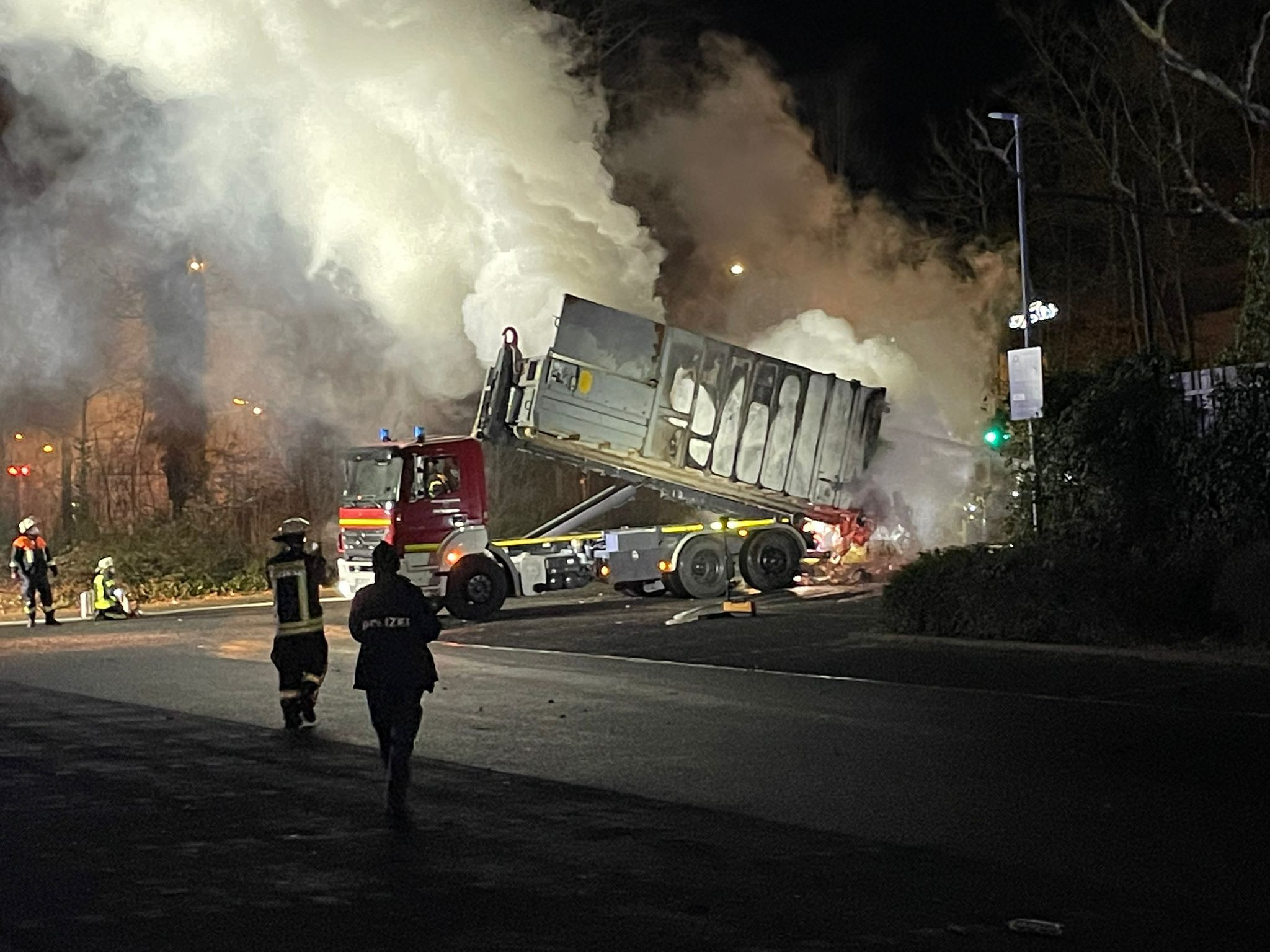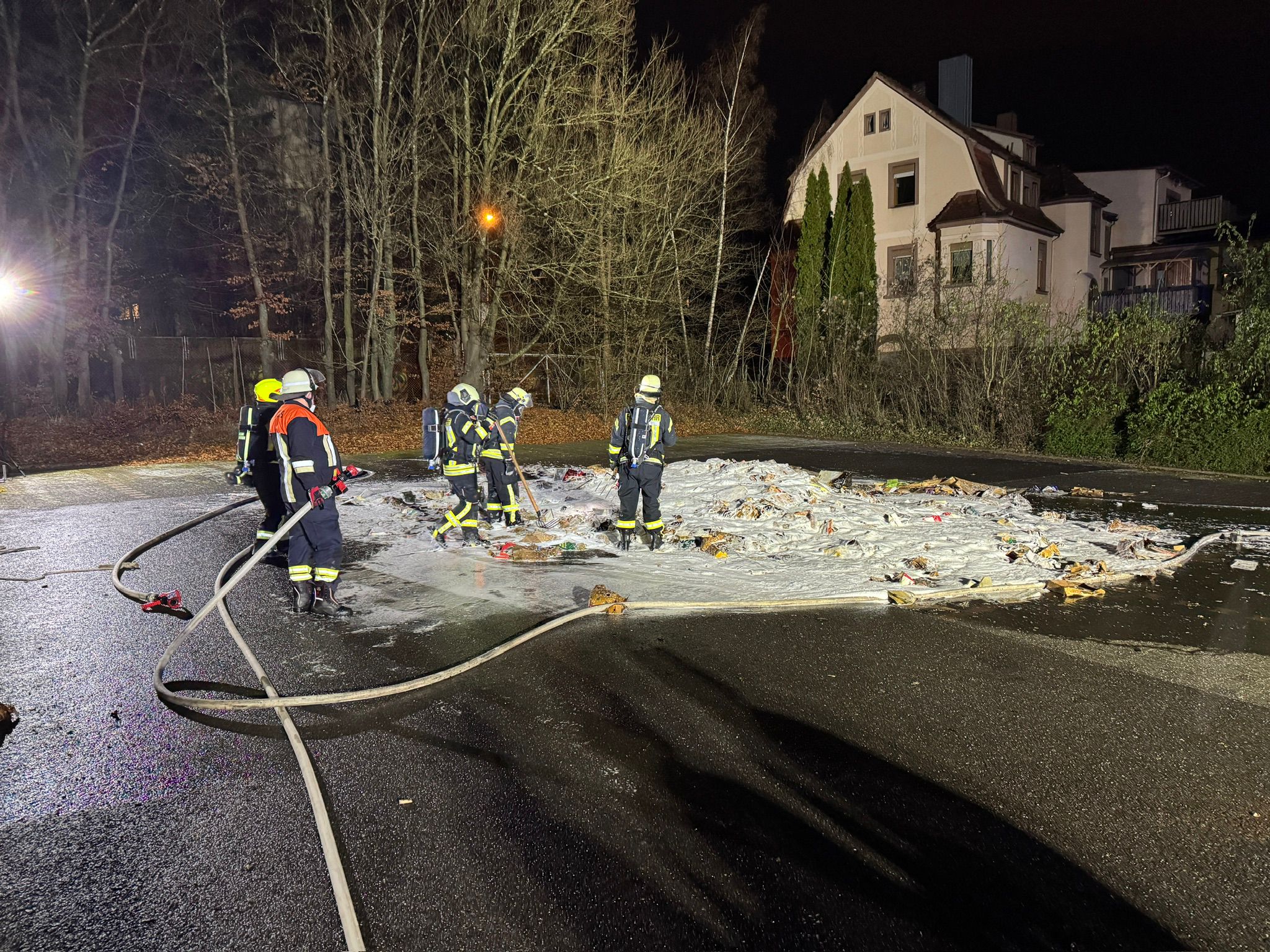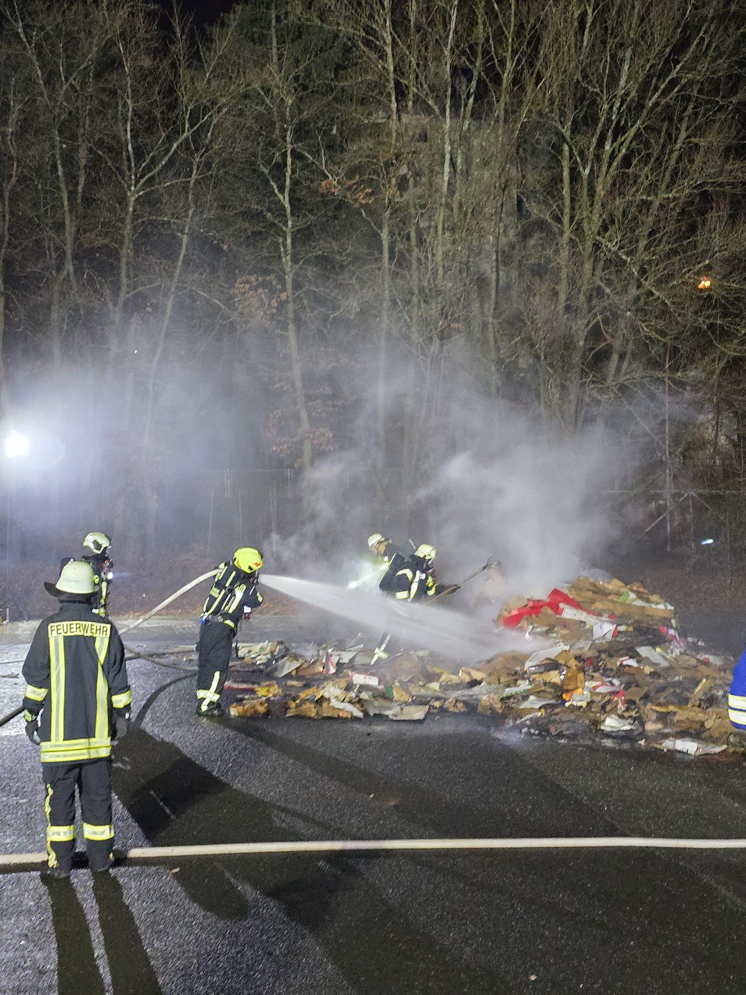 - Brandbekämpfung des aus dem Container ausgeleerten Materials unter Atemschutz